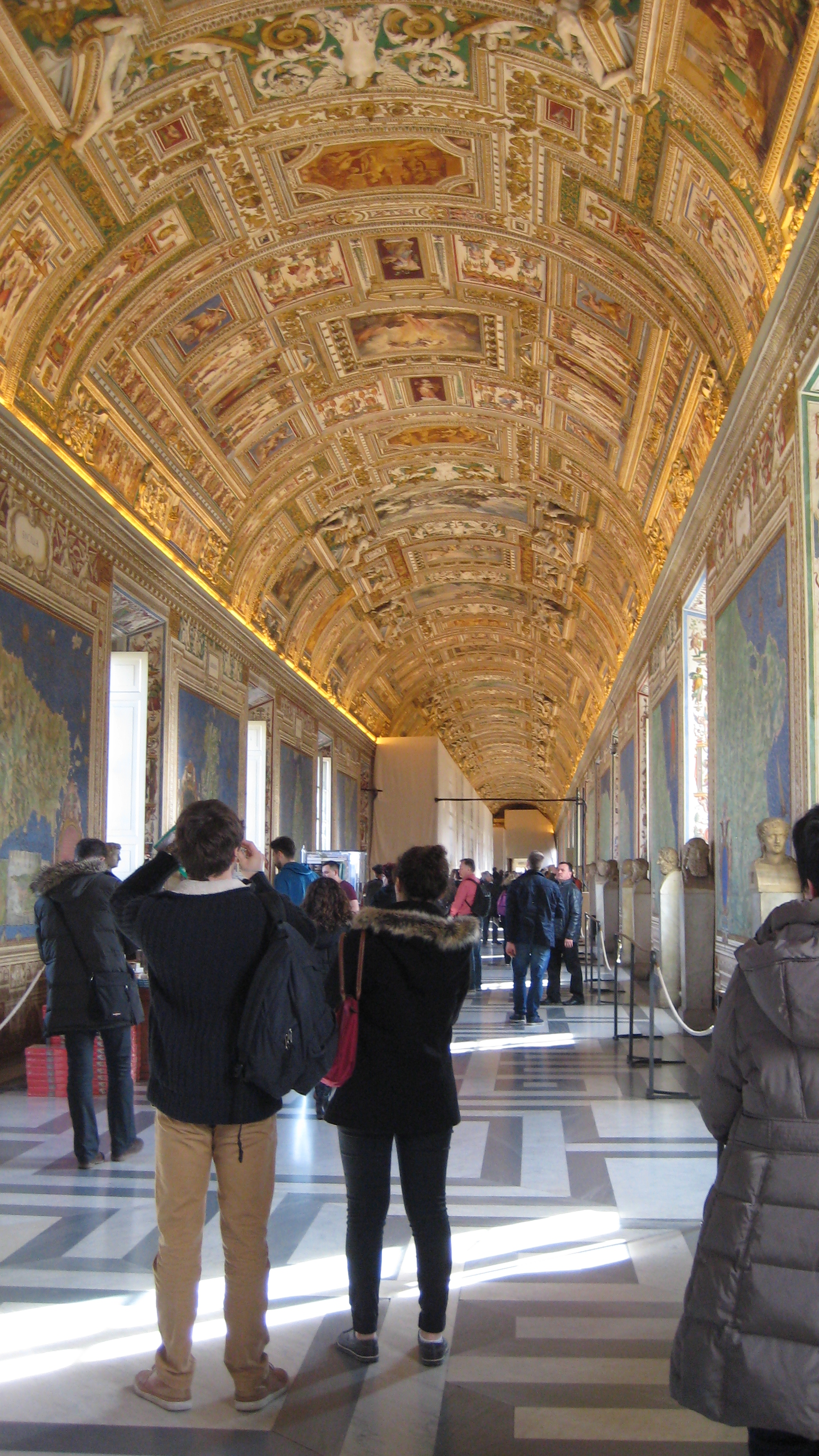 Dann fing es an zu regnen. Trotzdem setzten wir unsere Tour zum Vatikan fort und mussten feststellen, dass wir den Petersplatz in größerer Vorstellung hatten. Wegen der langen Schlange vor dem Petersdom gingen wir zuerst in die Vatikanischen Museen ( ohne anzustehen!). Von ägyptischer Kultur über Landkarten, gigantischen Wandteppichen, übergroßen Fresken und Statuen bis hin zur Sixtinischen Kapelle war alles dabei. Besonders beeindruckend waren aber die Stanzen des Raffael und Michelangelos Fresken. Vier Stunden lang ließen wir uns mit vergangenen Zeiten vor Augen berieseln. Der Audio-Guide, der uns begleitete, war eine sehr gute Investition gewesen.